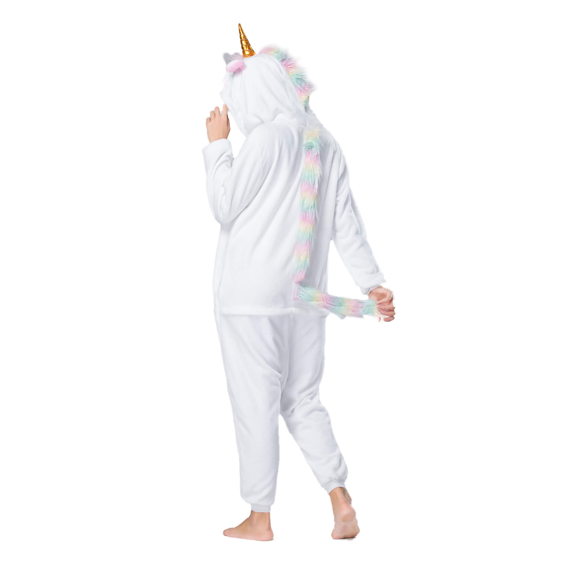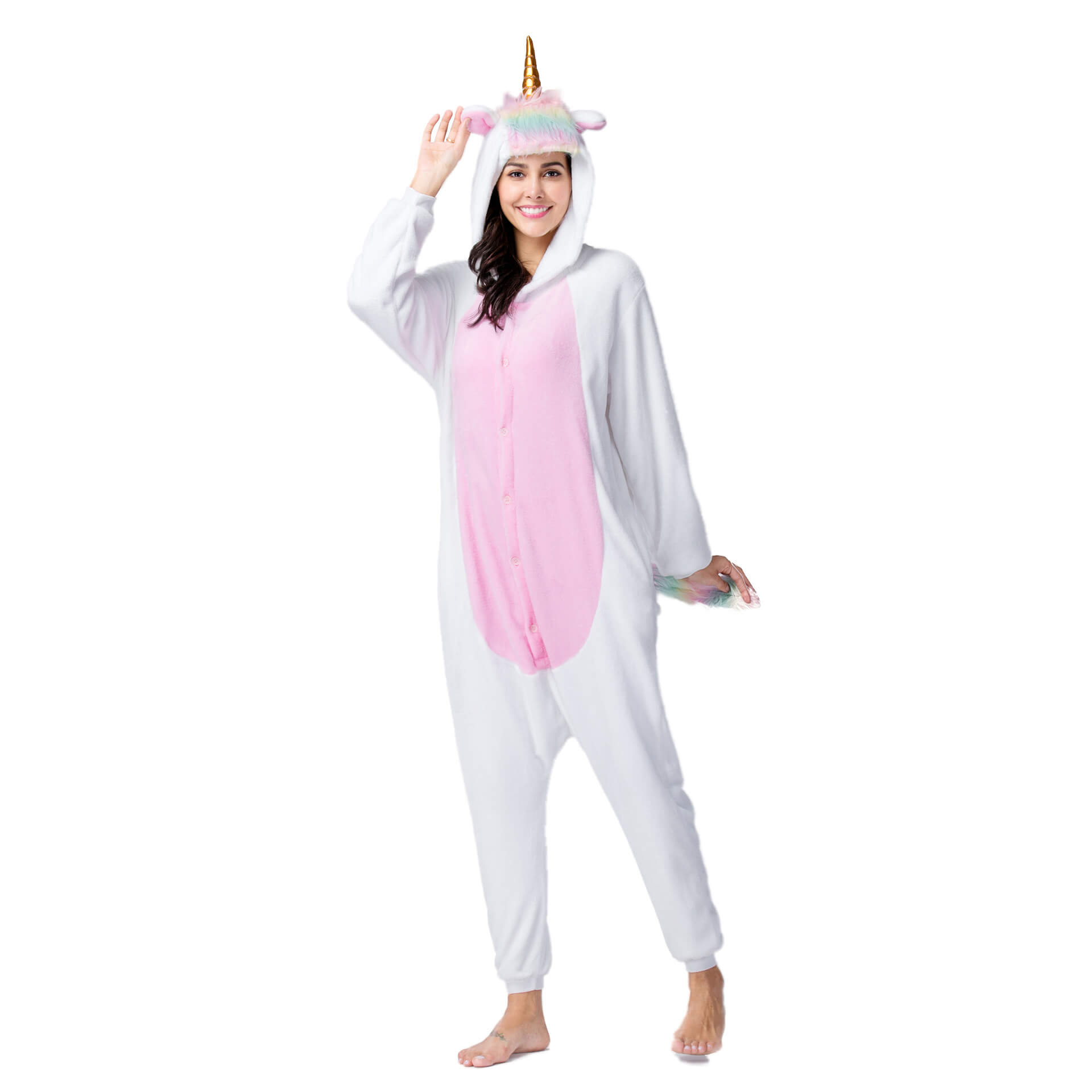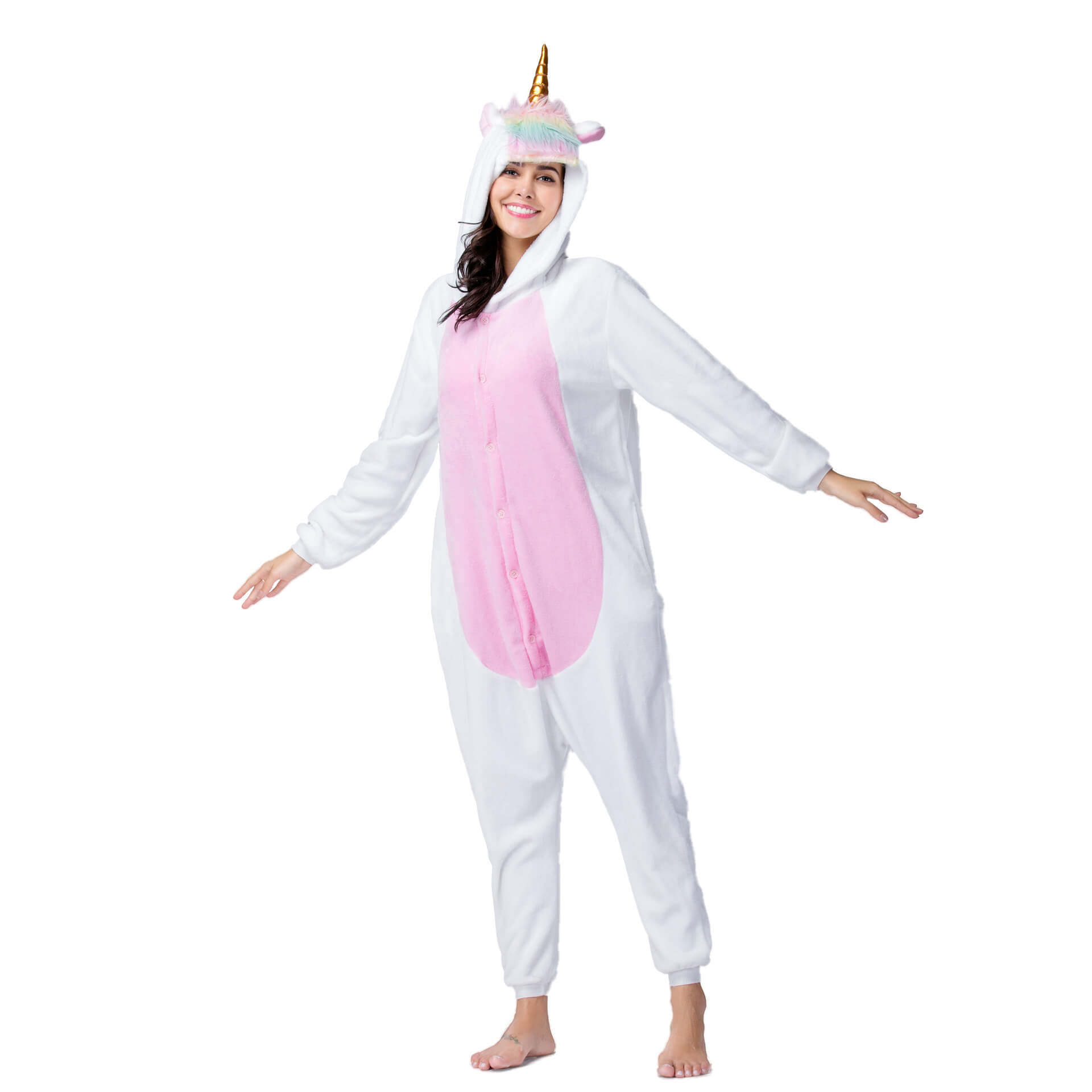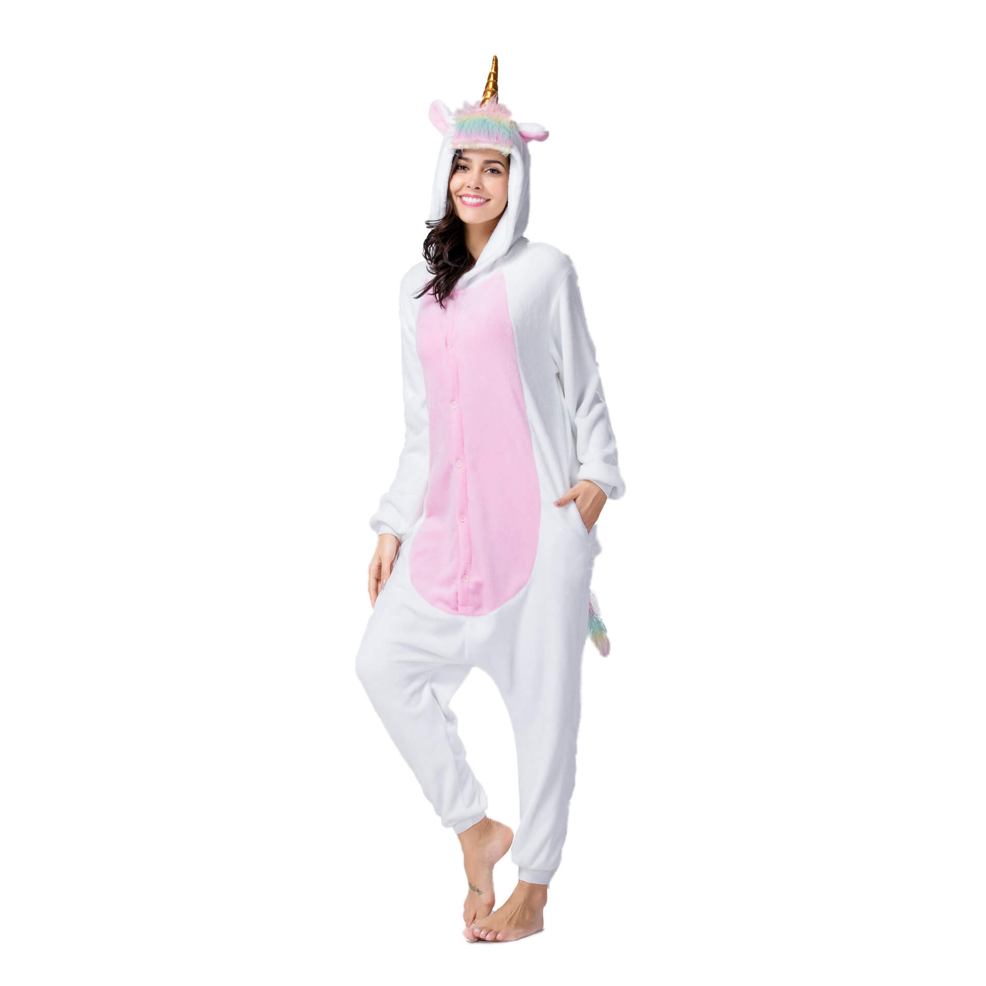 С этой пижамой вы сразу же превратитесь в Единорога с золотым рогом, милыми розовыми ушками и разноцветным хвостом, благодаря чему она является очень популярной. Застегните пуговки спереди, молнию для туалета сзади, и почувствуйте все тепло которое дарит пижама.