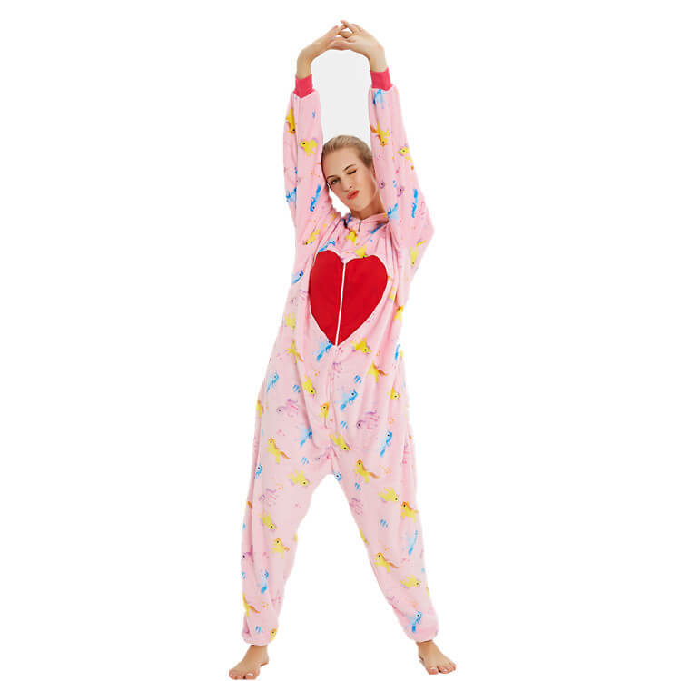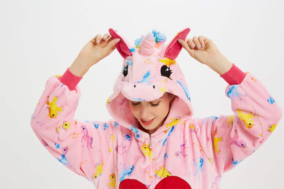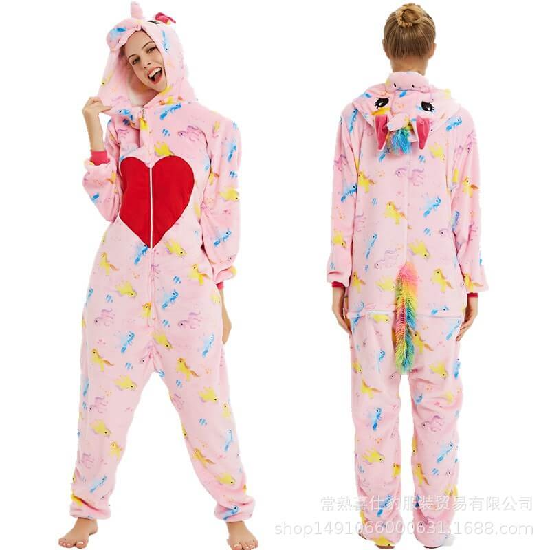 З цією піжамою ви відразу перетворитесь на Єдинорога з милими єдиноріжками по всьому тілу, і великим червоним серцем, завдяки чому вона є дуже популярною. Застебніть блискавку спереду, блискавку для туалету ззаду, і відчуйте все тепло, яке дарує піжама.