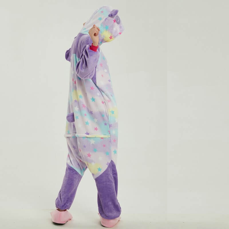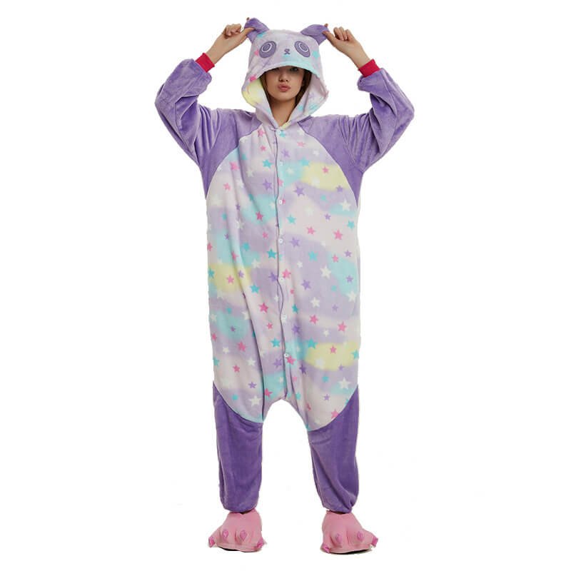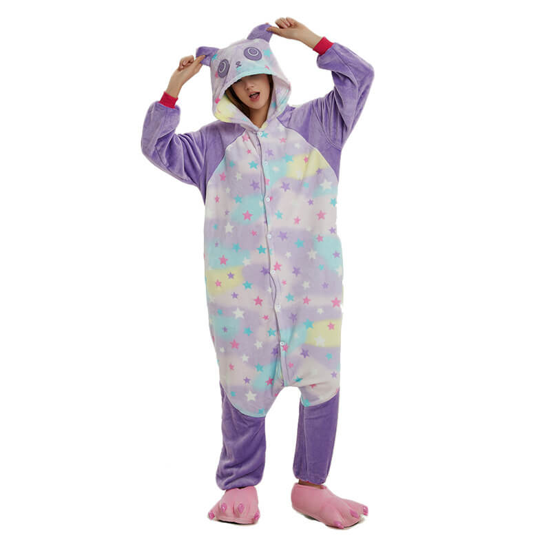 З цією піжамою ви відразу перетворитесь на Панду з зірками по всьому тілу, маленькими вушками і хвостиком, завдяки чому вона є дуже популярною. Застебніть гудзики спереду, блискавку для туалету ззаду, і відчуйте все тепло, яке дарує піжама.